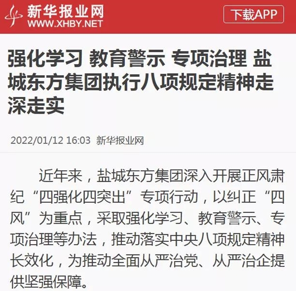 1月12日,新華報業(yè)網(wǎng)關(guān)注報道鹽城東方集團落實中央八項規(guī)定精神長效化重要舉措。