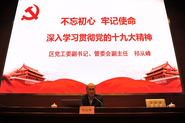 12月4日下午,區(qū)黨工委副書記、管委會副主任祁從峰在區(qū)管委會招商中心2樓西會議室為區(qū)屬國有平臺公司東方集團(tuán)、世紀(jì)新城集團(tuán)員工宣講黨的十九大精神。他強調(diào),要認(rèn)真學(xué)習(xí)貫徹黨的十九大精神,以習(xí)近平新時代中國特色社會主義思想為指引,推動黨的十九大精神在國有企業(yè)落地生根、推動轉(zhuǎn)型發(fā)展。東方集團(tuán)黨委書記、董事長張振國主持宣講會并對貫徹落實祁書記講話精神提具體要求。東方集團(tuán)領(lǐng)導(dǎo)班子全體成員,集團(tuán)本部、東方置業(yè)、東方市政、永泰投資、燕舞集團(tuán)全體工作人員,其他子公司班子成員150余人參加會議。