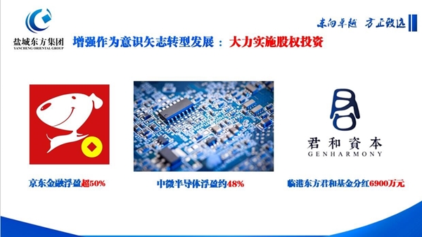 面對曾經(jīng)取得的成績、贏得的贊譽,張振國坦言,集團上下并沒有沾沾自喜,而是把目光放得更遠、思維拓得更寬、腳步邁的更加穩(wěn)健,始終把招商引資、股權投資作為集團解放思想促轉(zhuǎn)型的重要強力引擎,在今年上半年已簽約7個招商引資項目、3個項目近期上會評審,實施市場化投資項目5個、投資金額達6.8億元;股權投資收益突出,京東金融浮盈超過50%、中微半導體項目浮盈約為48%、上海臨港東方君和基金分紅6900萬元,在轉(zhuǎn)型發(fā)展上再創(chuàng)新業(yè)績。