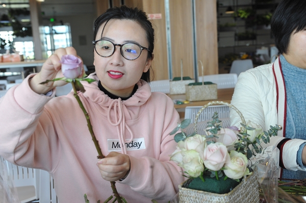 浪漫的紅色的玫瑰,典雅素凈的藍(lán)香草,如星空般絢麗的滿天星……各色花卉整齊擺放在桌上等待挑選。此次活動(dòng)特別邀請(qǐng)了插花藝術(shù)老師進(jìn)行現(xiàn)場(chǎng)培訓(xùn),花藝師對(duì)花藝?yán)碚撝R(shí)進(jìn)行了簡(jiǎn)單介紹,包括插花的特點(diǎn),有時(shí)間性,生命性,時(shí)尚性,裝飾性,并示范多種造型的插花,為大家展示插花藝術(shù)。大家對(duì)插花藝術(shù)興趣極高,紛紛與花藝師交流互動(dòng),請(qǐng)教插花方面的知識(shí),在悠然的花香浸染間,一起學(xué)習(xí)花藝?yán)碚摗?/span>