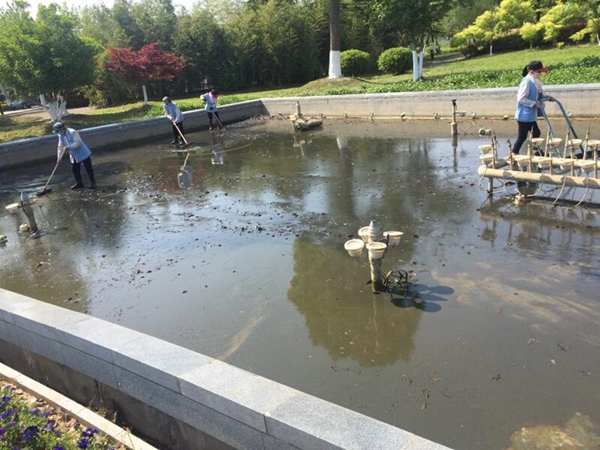 為了給“5.18”提供一個干凈整潔的外部環(huán)境,五一假期的后兩天,東方物業(yè)會展中心環(huán)境部、工程部等工作人員一齊上陣,共同清理鹽城國際會展中心噴泉池和廣場。東方物業(yè)人紛紛拿上鏟子、掃帚、高壓水槍等工具開始忙碌,有的清洗水池的淤泥,刮除附著在水池壁、低的青苔;有的清理腐爛的垃圾;有的用高壓水槍對池壁、池底的污物進行全面沖洗……一番熱火朝天的忙碌后,污水和汗水交融在一起,但大家沒有一句怨言,噴泉池及廣場煥然一新。
