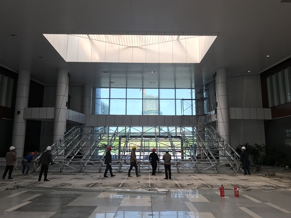 截至假期結束,項目現(xiàn)場三塊LED屏主體框架已基本完成,項目效果初現(xiàn);二樓會議大廳已完成頂部噴淋改造,舞臺燈具槽、吊頂及會場燈具正在安裝施工中,整體工程力保5月15日前順利交付使用。