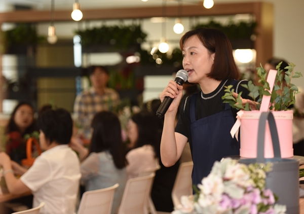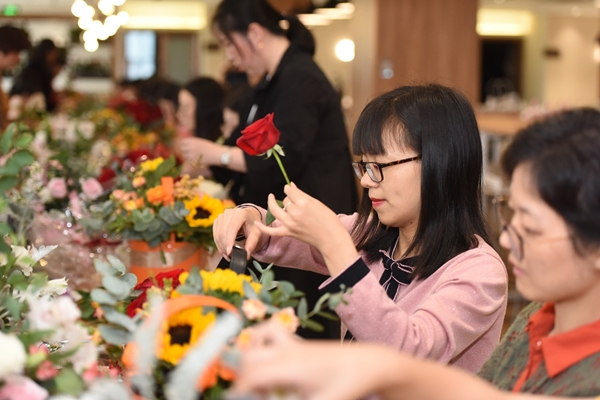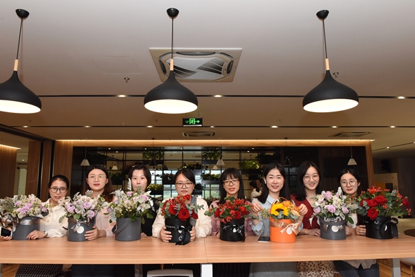 在花藝?yán)蠋煹闹v解和指導(dǎo)下,女職工們熱情高漲,發(fā)揮對美的想象和創(chuàng)意,全身心地投入作品創(chuàng)作中。將花卉精心地修剪、整枝,經(jīng)過系列藝術(shù)加工,一朵朵鮮花、一片片綠枝,在一雙雙巧手的擺弄中錯(cuò)落有致地插在一起,花藝課堂彌漫著淡淡的香氣,一盆盆燦爛繽紛、溫馨秀美的花藝作品“新鮮出爐”,大家手捧著自己的得意之作,臉上洋溢著喜悅之情。