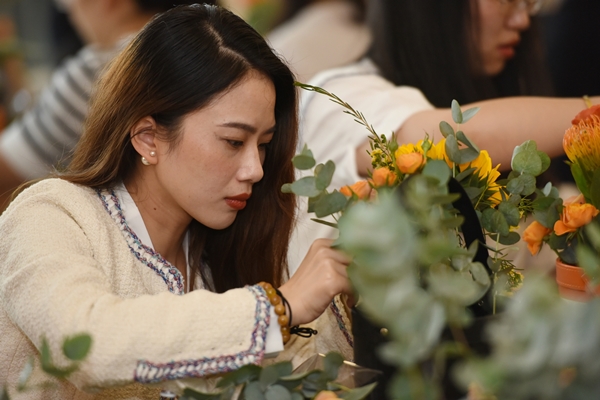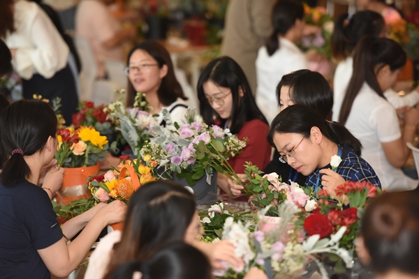 一把剪刀,一塊花泥,一個(gè)花籃,一束搭配好的鮮花。在一片芬芳的花香中,插花藝術(shù)創(chuàng)作正式拉開帷幕。