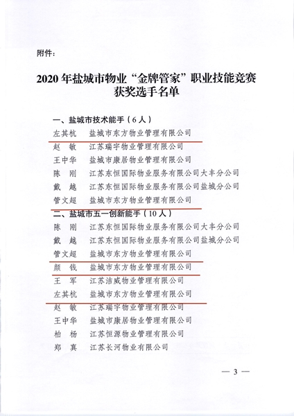 日前,鹽城市住建局、市人社局、市總工會(huì)聯(lián)合發(fā)布《2020年鹽城市物業(yè)“金牌管家”職業(yè)技能競(jìng)賽獲獎(jiǎng)選手名單的通知》,鹽城市東方物業(yè)管理有限公司3名選手榜上有名。其中,東方物業(yè)副總經(jīng)理左其杭、東方物業(yè)工程部設(shè)備維護(hù)員管文超兩人均獲得“鹽城市技術(shù)能手”“鹽城市五一創(chuàng)新能手”稱號(hào),東方物業(yè)工程部工程維修管理員顏錢獲得“鹽城市五一創(chuàng)新能手”稱號(hào)。