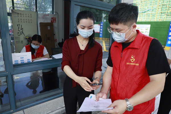 集團(tuán)黨員志愿者指導(dǎo)集團(tuán)來訪者掃碼查驗(yàn),做好臺(tái)賬登記。