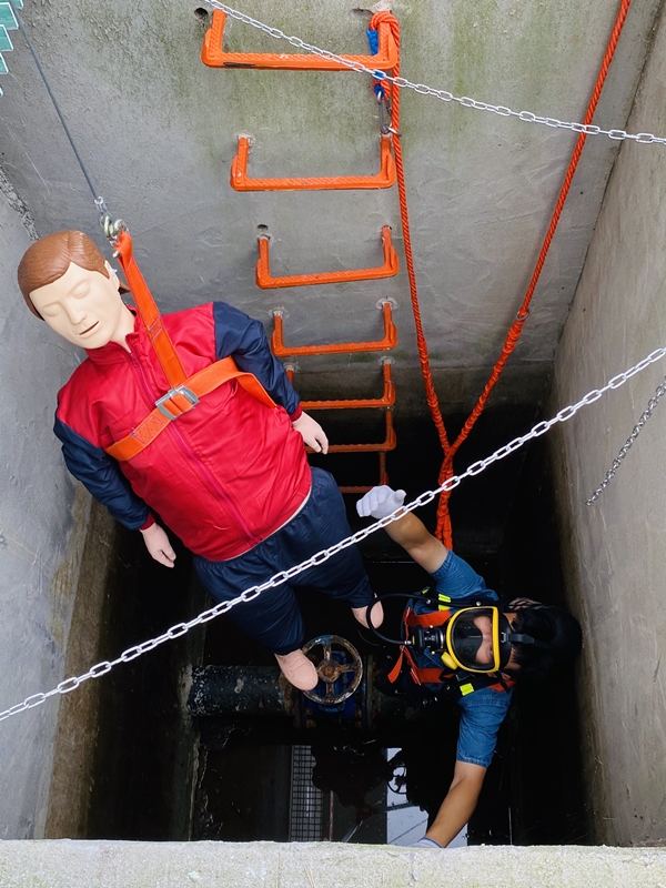 水務(wù)公司總經(jīng)理沈效偉宣布演練開始。作業(yè)流程審批、現(xiàn)場安全教育、防護(hù)用具穿戴、井蓋通風(fēng)、氣體檢測、通訊設(shè)備調(diào)試、安全監(jiān)護(hù)等整個(gè)演示過程井然有序,規(guī)范嚴(yán)謹(jǐn)。隨后,模擬作業(yè)人員窒息,下井作業(yè)人員因硫化氫中毒昏倒在井內(nèi),作業(yè)負(fù)責(zé)人按要求上報(bào),啟動(dòng)應(yīng)急預(yù)案,救援組到達(dá)現(xiàn)場后,救援人員將防護(hù)服、氧氣管、報(bào)警器等穿戴整齊后下入井內(nèi),再將窒息者通過三腳架提升起來,轉(zhuǎn)移到空氣新鮮地方,使其平躺,由救護(hù)人員模擬心肺復(fù)蘇,經(jīng)過半個(gè)小時(shí)緊張有序的演練,“傷員”得到有效救治,事故得到有效處置。過程中指導(dǎo)人員提醒注意事項(xiàng),參與演習(xí)人員分別親自上手進(jìn)行了模擬救援。