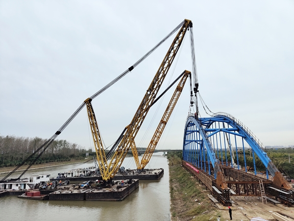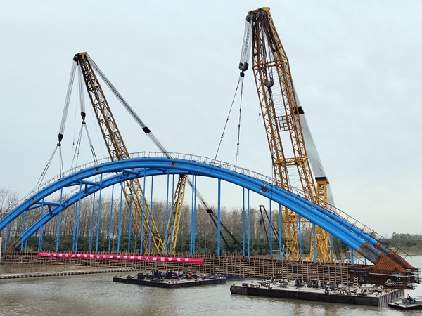 10月20日13時(shí)20分,在鹽城經(jīng)開(kāi)區(qū)德喜大橋施工現(xiàn)場(chǎng),跨徑97米、重480噸的勁性骨架系桿拱在兩艘大型浮吊船的聯(lián)合起吊下,平穩(wěn)安裝至主墩位置,完成主橋上部結(jié)構(gòu)整體吊裝,標(biāo)志著德喜大橋順利完成合龍,項(xiàng)目施工進(jìn)入新的階段。