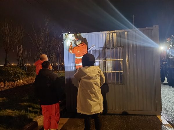 19日下午,根據(jù)區(qū)主要領(lǐng)導(dǎo)關(guān)于增設(shè)雨棚、監(jiān)控攝像頭、進出口隔離帶與值守集裝箱的整改意見,他們一著不讓、一刻不拖,在接近零下的低溫環(huán)境中,冒著瓢潑的凍雨和冰雹,繼續(xù)打足人手、上足機械、保足物資,又是一夜奮戰(zhàn),又是一場硬仗,直至全面完成。