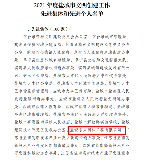 “水清、岸綠、景美,生活在這里,幸福感滿滿”“家門口就有散步休閑的去處,太方便了”……夏日清晨,東郊迎賓公園里晨練的市民連連感嘆。近年來,鹽城東方園林有限公司聚焦人民群眾需求,下大力氣推進(jìn)基礎(chǔ)設(shè)施建設(shè),持續(xù)完善城市功能,潛心提升城市品位,讓幸福感在“家門口”落地生根……城市發(fā)展的每一個(gè)細(xì)微變化,都回響著鹽城東方園林人逐夢(mèng)前行的鏗鏘足音。日前,鹽城市委、市政府發(fā)布表彰決定,鹽城東方園林有限公司(以下簡(jiǎn)稱“東方園林”)獲評(píng)“2021年度鹽城市文明創(chuàng)建工作先進(jìn)集體”稱號(hào)。