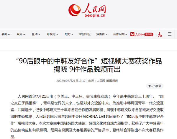 近日,由人民網(wǎng)韓國(guó)公司與韓國(guó)中央日?qǐng)?bào)CHINA LAB共同舉辦的“90后眼中的中韓友好合作”短視頻大賽評(píng)選結(jié)果揭曉,鹽城東方集團(tuán)參賽作品《東方睦鄰 一見“青”心》從415件參賽作品脫穎而出,榮獲大賽銀獎(jiǎng)。