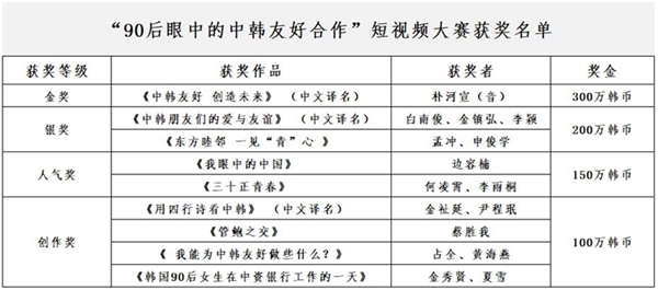 大賽專家評(píng)審團(tuán)表示,這部作品彰顯了中韓兩國(guó)經(jīng)貿(mào)領(lǐng)域合作及人文交流成果,是建交30年來(lái)中韓經(jīng)濟(jì)合作促進(jìn)人文交流的一個(gè)縮影。
