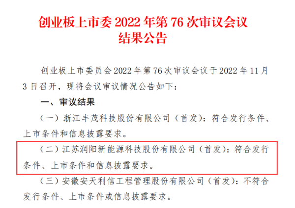 11月3日,深圳證券交易所創(chuàng)業(yè)板上市委員會發(fā)布公告,江蘇潤陽新能源科技股份有限公司(以下簡稱“潤陽股份”)的首次公開發(fā)行股票申請符合發(fā)行條件、上市條件和信息披露要求。
