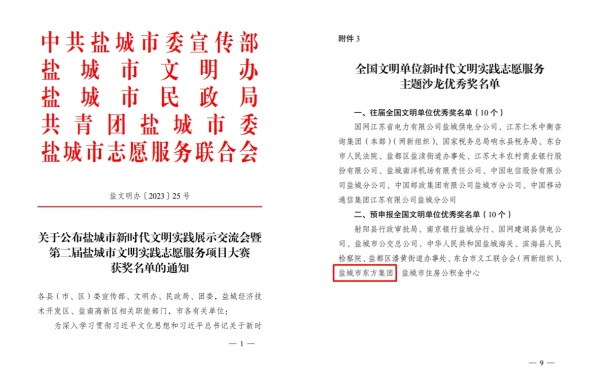 12月15日,鹽城市精神文明建設(shè)委員會(huì)辦公室發(fā)布《關(guān)于公布鹽城市新時(shí)代文明實(shí)踐展示交流會(huì)暨第二屆鹽城市文明實(shí)踐志愿服務(wù)項(xiàng)目大賽獲獎(jiǎng)名單的通知》,鹽城東方集團(tuán)榮膺“全國(guó)文明單位新時(shí)代文明實(shí)踐志愿服務(wù)主題沙龍優(yōu)秀獎(jiǎng)”,名列“預(yù)申報(bào)全國(guó)文明單位優(yōu)秀獎(jiǎng)名單”前10名。