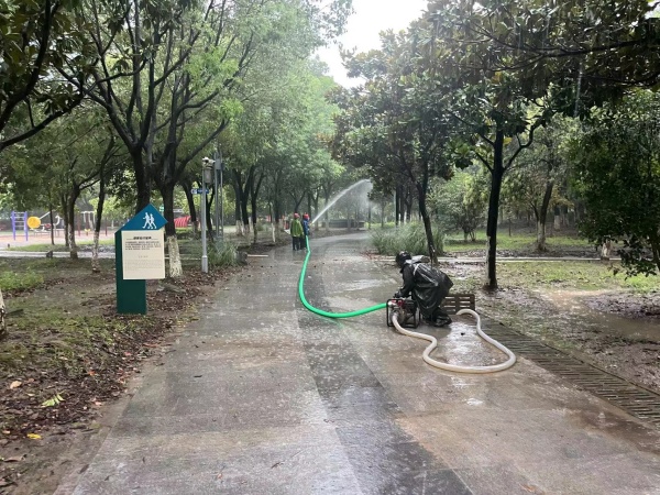 因瞬時雨量大,河道水位已在橋梁板涵頂部,導(dǎo)致市政道路積水嚴重,水位下降緩慢,東方安通公司市政維護管理處對開發(fā)區(qū)內(nèi)市政道路積水情況持續(xù)排查。根據(jù)上級預(yù)警信息,東方安通公司立即啟動應(yīng)急預(yù)案,成立防汛突擊隊,迅速展開防汛排澇工作,對區(qū)內(nèi)嫩江路(泰山路至黃山)、泰山路(松江路至新都路)、北舍路(世紀大道至新安江路)、新都路(未來科技城南側(cè))、烏江路(東環(huán)路至華山路)等道路積水嚴重路段進行搶排,截止9月11日23:30已基本完成道路積水排除工作。