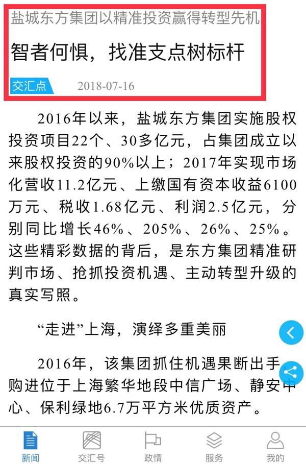 繼7月9日《鹽城東方集團15年如一日服務大局 奮發(fā)有為,共建共榮促發(fā)展》刊登后,7月16日,《新華日報》A5版,“交匯點”新聞客戶端,“新浪新聞”網(wǎng)站再次為鹽城東方集團打Call!http://xh.xhby.net/mp3/pc/c/201807/16/c506839.html(《新華日報》電子版)