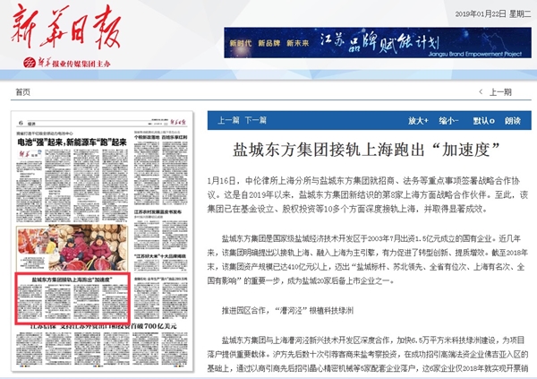 1月22日,《新華日報》A6版經(jīng)濟板塊刊登《鹽城東方集團接軌上海跑出“加速度”》一文,全面記錄了該集團接軌上海取得的成效,再度為東方集團點贊!
