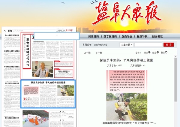 6月20日,鹽阜大眾報A2要聞版“厚德鹽城”欄目刊登報道《保潔員李加英:平凡崗位傳遞正能量》,平實(shí)訴說著榜樣的力量,似“潤物細(xì)無聲”一般,用平凡工作書寫不平凡歷程,展示了新時代東方集團(tuán)人信仰堅(jiān)定、勇于擔(dān)當(dāng)、甘于奉獻(xiàn)的精神風(fēng)貌。