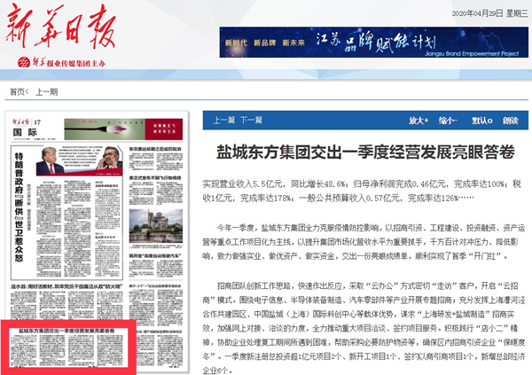 4月29日,《新華日?qǐng)?bào)》以《鹽城東方集團(tuán)交出一季度經(jīng)營(yíng)發(fā)展亮眼答卷》為題,報(bào)道了鹽城東方集團(tuán)一季度經(jīng)營(yíng)發(fā)展的主要做法和成果。