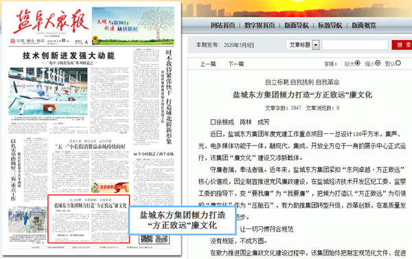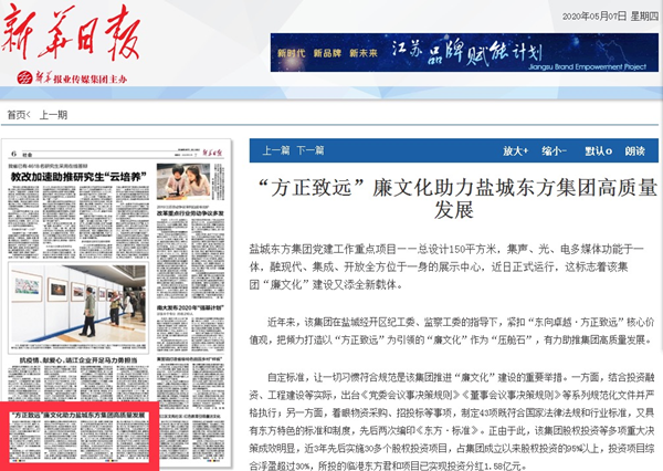 5月7日,《新華日報》A6版、“交匯點”客戶端、《鹽阜大眾報》頭版,相繼報道了鹽城東方集團“廉文化”建設(shè)助力企業(yè)高質(zhì)量發(fā)展的舉措和成果。