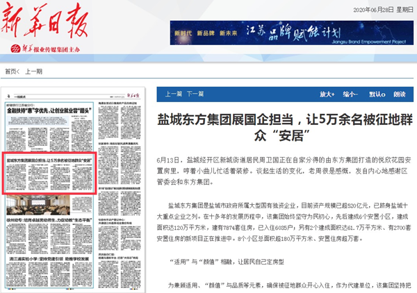 2020年6月28日《新華日報》第4版:“一線視點”刊發(fā)《鹽城東方集團展國企擔當,讓5萬余被征地群眾“安居”》。