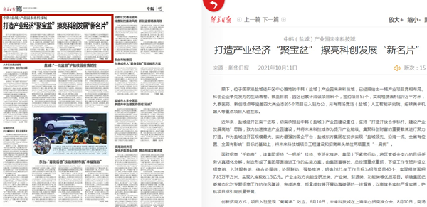 10月11日,《新華日?qǐng)?bào)》15版頭條聚焦中韓(鹽城)產(chǎn)業(yè)園未來科技城,以鹽城經(jīng)開區(qū)聚力打造提升產(chǎn)業(yè)能級(jí)、集聚科創(chuàng)財(cái)富的重要載體為重點(diǎn),深入報(bào)道鹽城東方集團(tuán)將未來科技城項(xiàng)目工程建設(shè)和招商牽頭單位兩項(xiàng)重責(zé)“一肩挑”,創(chuàng)新招商方式,賦能營商環(huán)境,吸引一系列優(yōu)質(zhì)項(xiàng)目紛至沓來的舉措和成果。