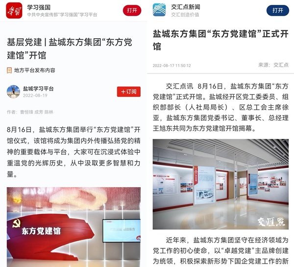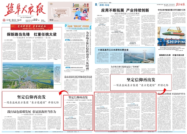 8月17日,“交匯點(diǎn)”新聞、鹽城新聞網(wǎng)發(fā)布《鹽城東方集團(tuán)“東方黨建館”正式開(kāi)館》,今天,《鹽阜大眾報(bào)》頭版、“我鹽新聞”客戶端、鹽城新聞網(wǎng)相繼發(fā)布《堅(jiān)定信仰再出發(fā)——寫(xiě)在鹽城東方集團(tuán)‘東方黨建館’開(kāi)館之際》文章,大篇幅、多角度地呈現(xiàn)了鹽城東方集團(tuán)以黨建為引領(lǐng),不斷深化黨建與業(yè)務(wù)融合,培育特色鮮明的黨建品牌,打造黨性教育的主陣地、主題活動(dòng)的大課堂、黨群融合的新平臺(tái)的幕后故事和亮點(diǎn)成果。