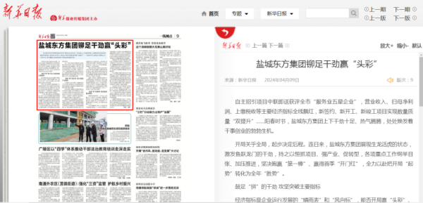 4月9日,《新華日報(bào)》第9版“一線視點(diǎn)”頭條,以《鹽城東方集團(tuán)鉚足干勁贏“頭彩”》為題,報(bào)道集團(tuán)高起點(diǎn)設(shè)標(biāo)、高速度起步、高質(zhì)量開局的生動實(shí)踐和亮點(diǎn)成績。