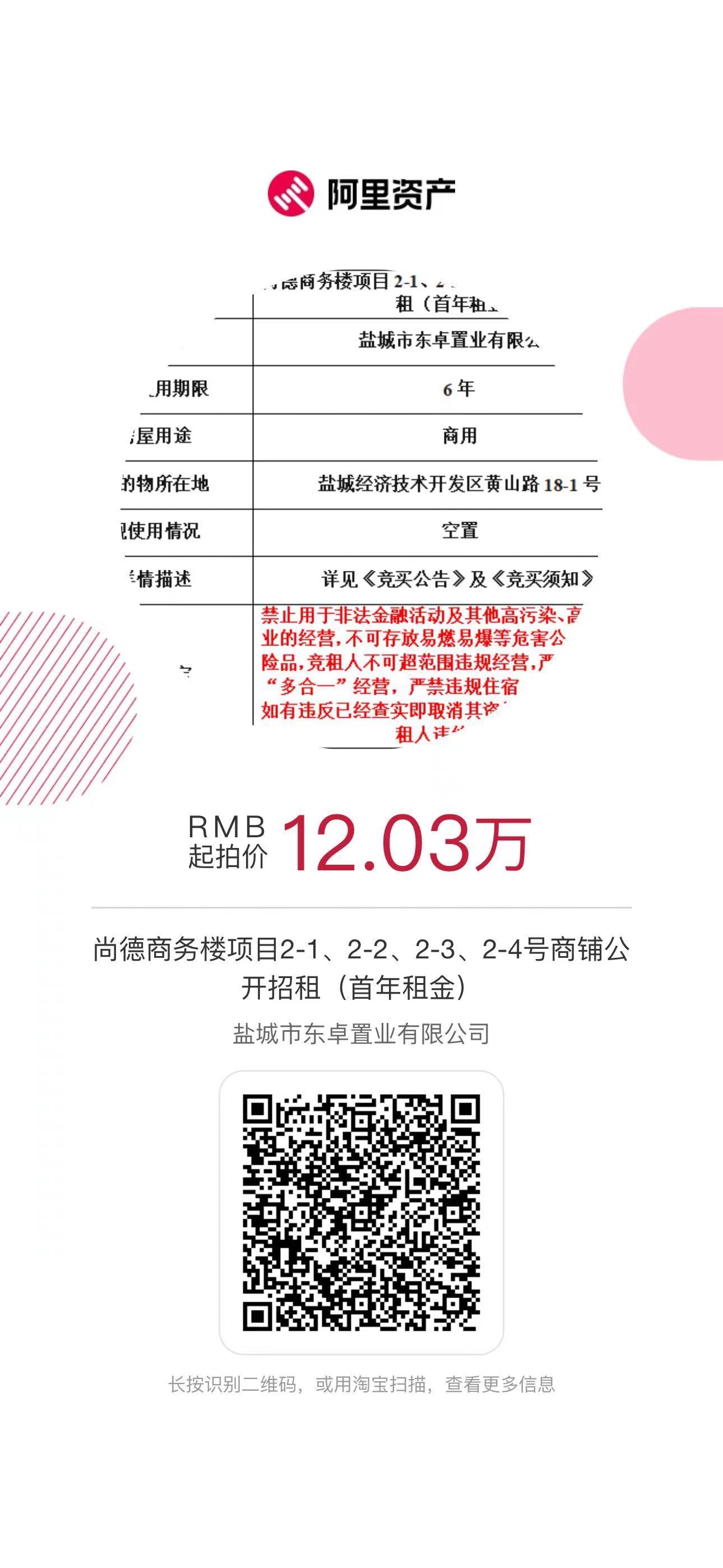 鹽城市東卓置業(yè)有限公司將于2023年6月16日10時起至2023年6月17日10時止(延時除外),在阿里拍賣平臺對鹽城經濟技術開發(fā)區(qū)黃山路18-1號尚德商務樓項目部分商鋪進行公開招租,價高者得,具體為: