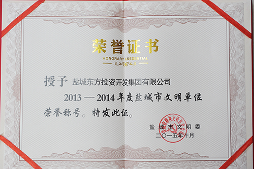鹽城市總工會授予鹽城東方投資開發(fā)集團有限公司工會委員會“鹽城市模范職工之家”榮譽稱號。 集團榮獲中共鹽城市委、鹽城市人民政府頒發(fā)的“創(chuàng)建全國文明城市工作先進單位”獎項。
