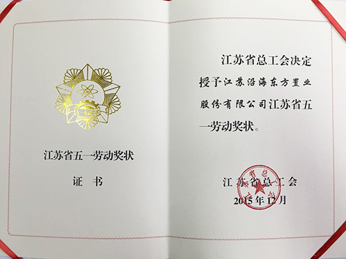 核心子公司江蘇沿海東方置業(yè)股份有限公司榮獲“江蘇省五一勞動獎狀”