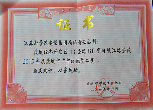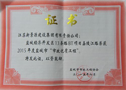 東方市政公司承建的鹽城經濟技術開發(fā)區(qū)13條路BT項目嘉陵江路、岷江路榮獲2015年度鹽城市“市政優(yōu)質工程”