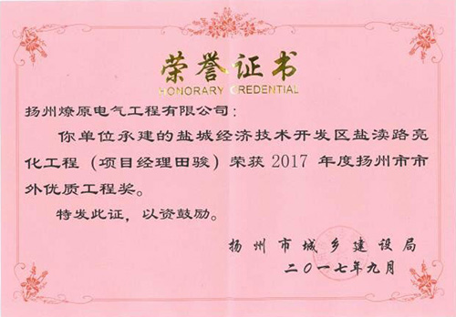 東方市政公司承建的鹽城經濟技術開發(fā)區(qū)鹽瀆路亮化工程榮獲2017年度揚州市市外優(yōu)質工程獎 東方置業(yè)公司承建的韓資工業(yè)園鄰里中心宿舍D/E/F樓土建、安裝、幕墻工程榮獲2017年度鹽城市優(yōu)質工程獎