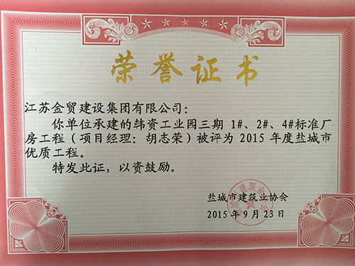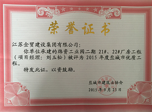 東方置業(yè)公司承建的韓資工業(yè)園二期21#、22#廠房和韓資工業(yè)園3期1#、2#、4#廠房及3#、6#、9#廠房 韓資工業(yè)園服務中心內裝飾工程榮獲2015年度鹽城市優(yōu)質工程