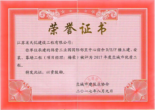 東方置業(yè)公司承建的韓資工業(yè)園鄰里中心宿舍D/E/F樓土建、安裝、幕墻工程榮獲2017年度鹽城市優(yōu)質工程獎