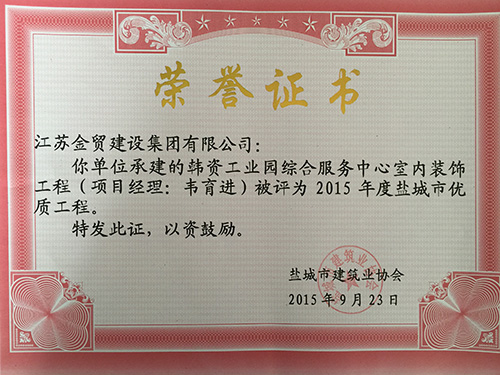 韓資工業(yè)園服務中心內裝飾工程榮獲2015年度鹽城市優(yōu)質工程