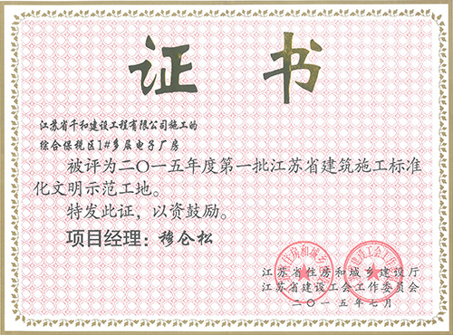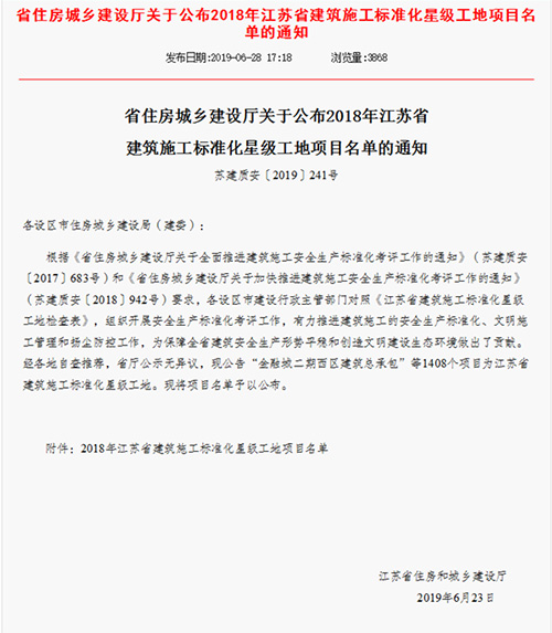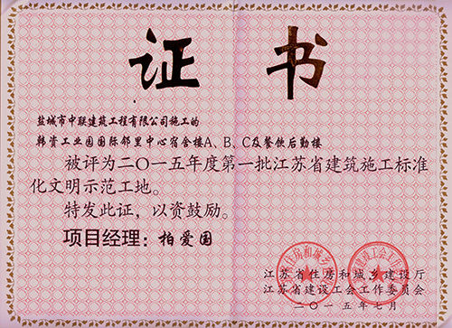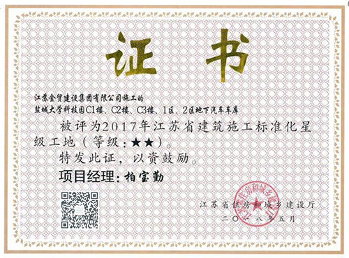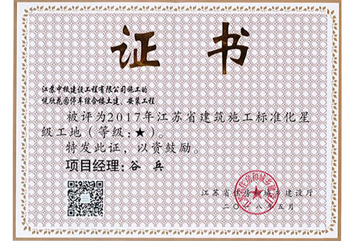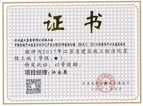 鹽城大學科技園(未來科技城)C1樓、C2樓、C3樓、1區(qū)、2區(qū)地下車庫項目榮獲“2017年度江蘇省建筑施工標準化星級工地”。 中韓鹽城產業(yè)園東方之洲門戶區(qū)B3研發(fā)辦公樓、B8大門、B11公共服務中心土建總承包工程榮獲“2017年度江蘇省建筑施工標準化星級工地”。