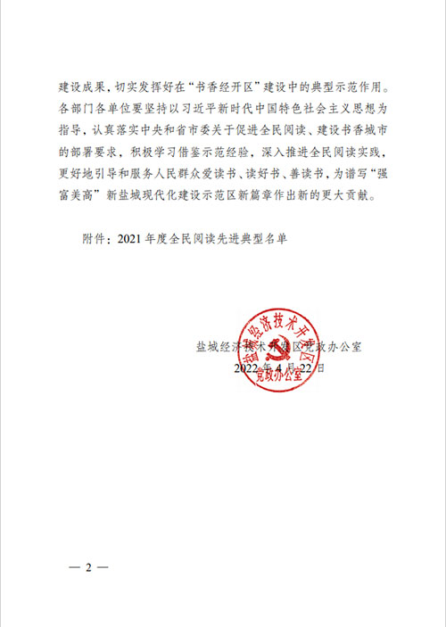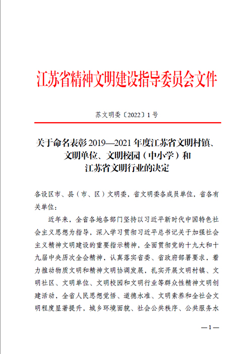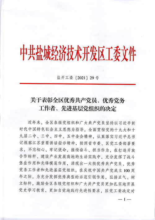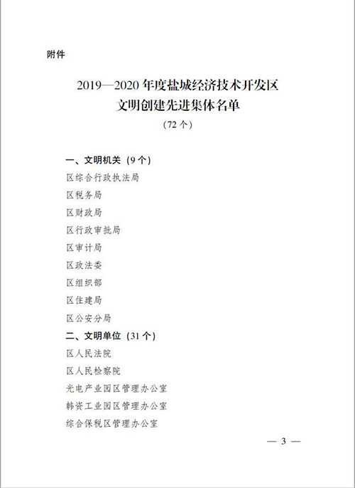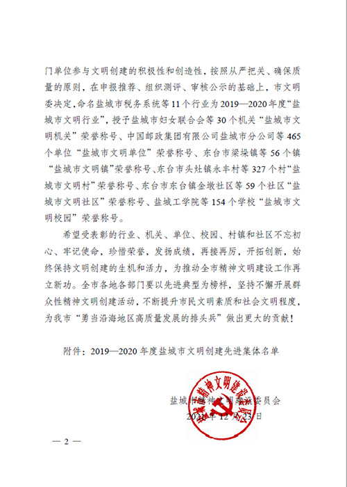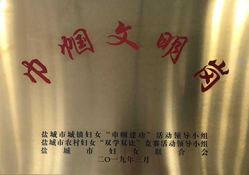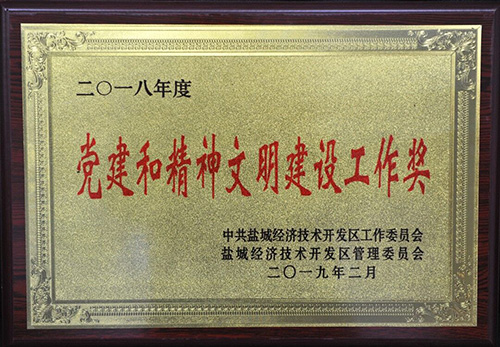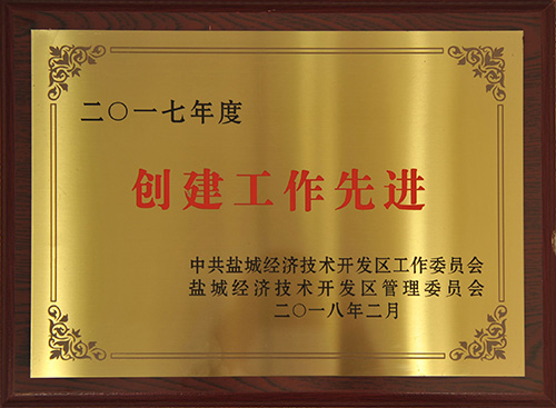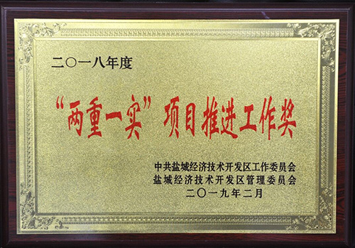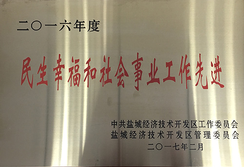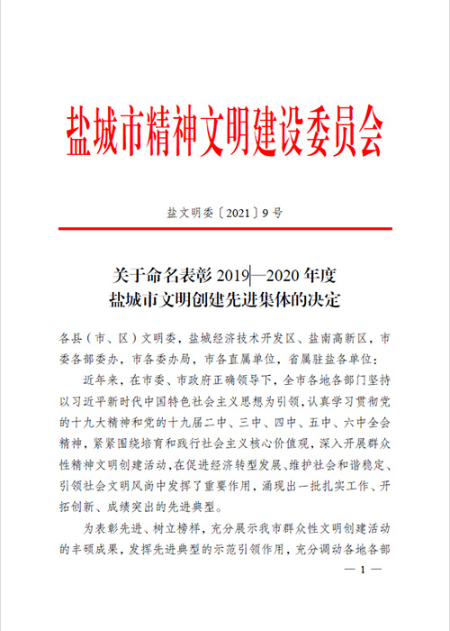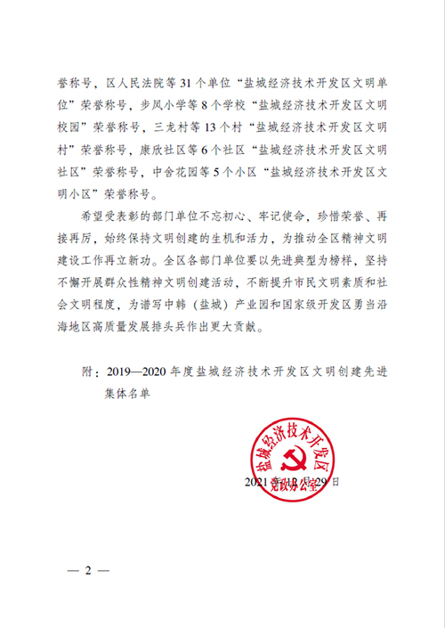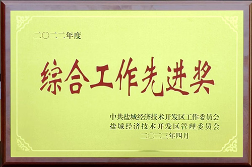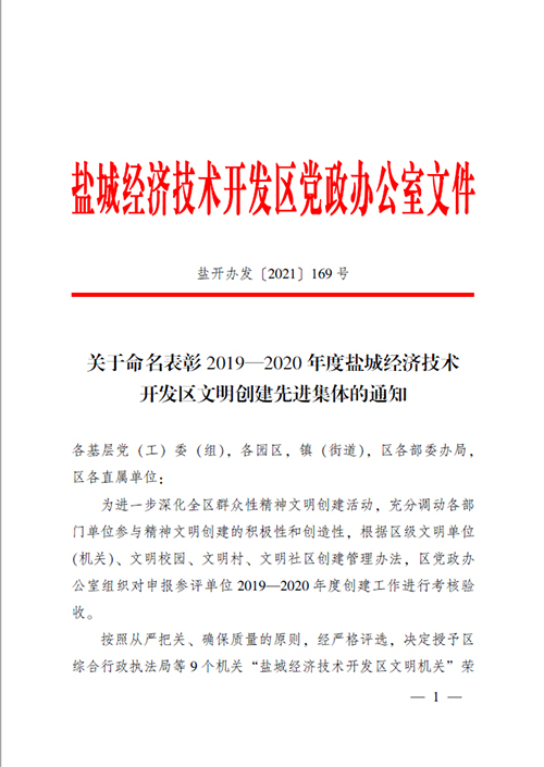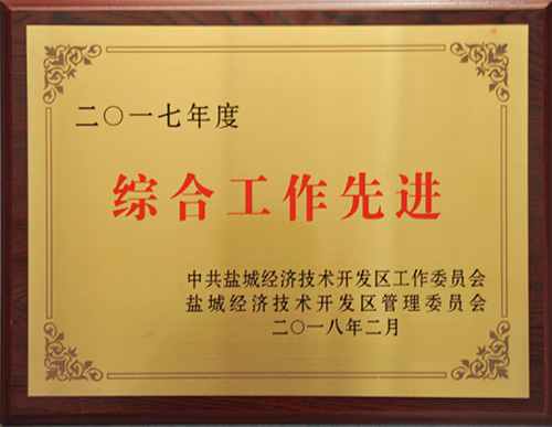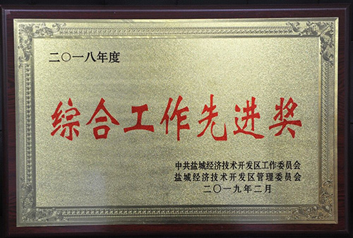 榮獲2019年度鹽城經濟技術開發(fā)區(qū)綜合工作先進獎。 榮獲2017-2018年度鹽城經濟技術開發(fā)區(qū)文明單位。