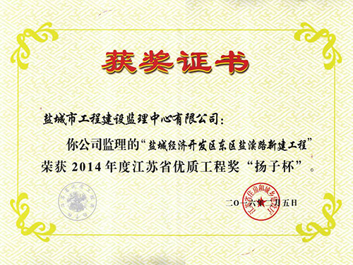 東方市政公司承建的鹽城經濟技術開發(fā)區(qū)東區(qū)鹽瀆路新建工程榮獲2014年度江蘇省優(yōu)質工程獎“揚子杯”