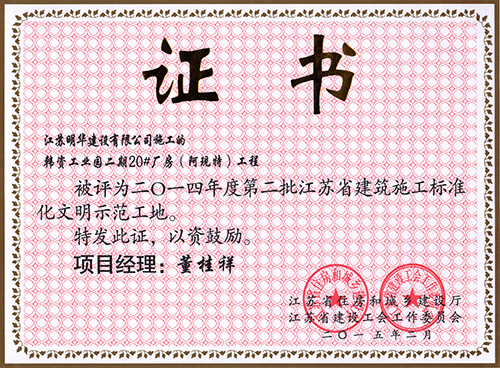 東方置業(yè)公司承建的韓資園二期20#廠房(阿現(xiàn)特)工程榮獲2014年度第一批江蘇省建筑施工標準化文明示范工地