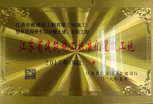 悅欣花園停車綜合樓土建、安裝工程榮獲“2017年度江蘇省建筑施工標準化星級工地”稱號
