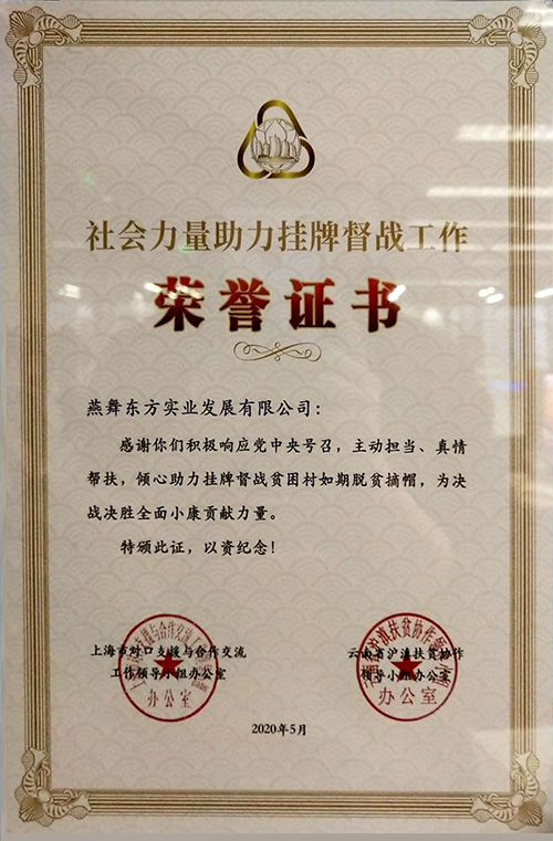 集團大樓所在的鹽城國際軟件園6#樓B座獲得江蘇省物業(yè)管理行業(yè)最高殊榮——“2019年度省級示范物業(yè)管理項目”稱號。 燕舞東方實業(yè)發(fā)展有限公司獲得社會力量助力掛牌督戰(zhàn)工作榮譽證書。