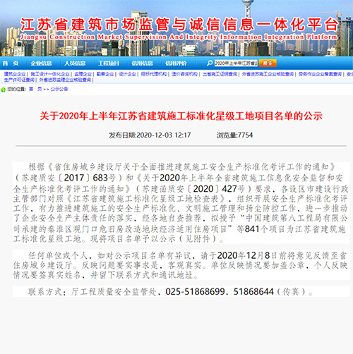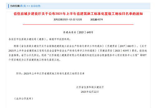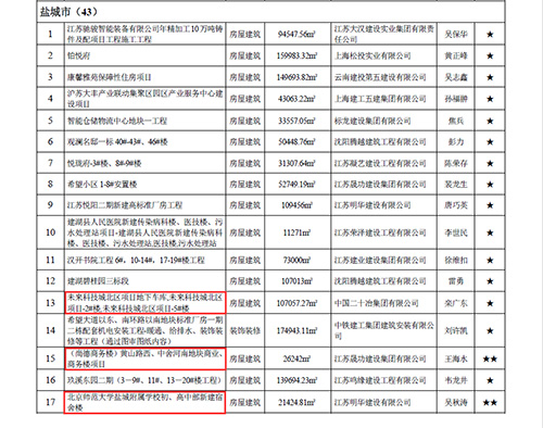 鹽城東尚德商務樓榮獲2021年度“江蘇省二星級施工標準化工地”;未來科技城北區(qū)、北師大鹽城附校(初、高中部)新建宿舍樓榮獲2021年度“江蘇省一星級施工標準化工地”。