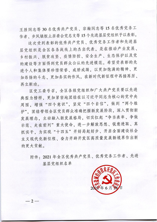 東方建設公司李青峰同志、東方地產公司李春成同志獲得2021年全區(qū)優(yōu)秀共產黨員榮譽;鹽城東方投資開發(fā)集團有限公司第二黨支部獲得2021年全區(qū)先進基層黨組織榮譽。