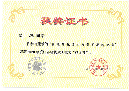 鹽城綜保區(qū)二期封關新建倉庫榮獲2020年度江蘇省優(yōu)質工程“揚子杯”。
