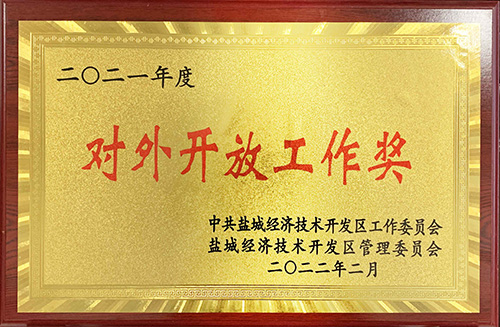 集團榮獲2021年度鹽城經濟技術開發(fā)區(qū)綜合工作先進獎,同時獲得對外開放工作單項獎。