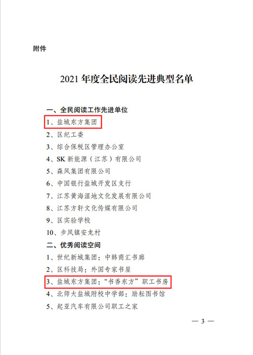鹽城東方集團榮獲2021年度區(qū)全民閱讀工作先進單位;鹽城東方集團”書香東方”職工書房榮獲區(qū)優(yōu)秀閱讀空間。
