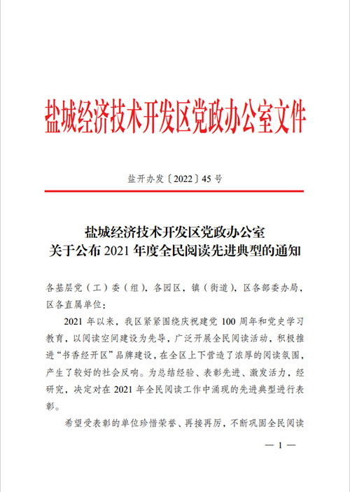 鹽城市總工會授予鹽城東方投資開發(fā)集團有限公司工會委員會2021年度“鹽城市五一勞動獎狀”。 集團榮獲鹽城經開區(qū)全民閱讀活動領導小組頒發(fā)的2020年度“全民閱讀工作先進單位”獎項。