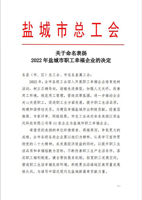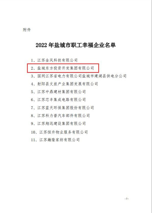 鹽城市總工會命名表揚鹽城東方集團為鹽城市職工幸福企業(yè)。